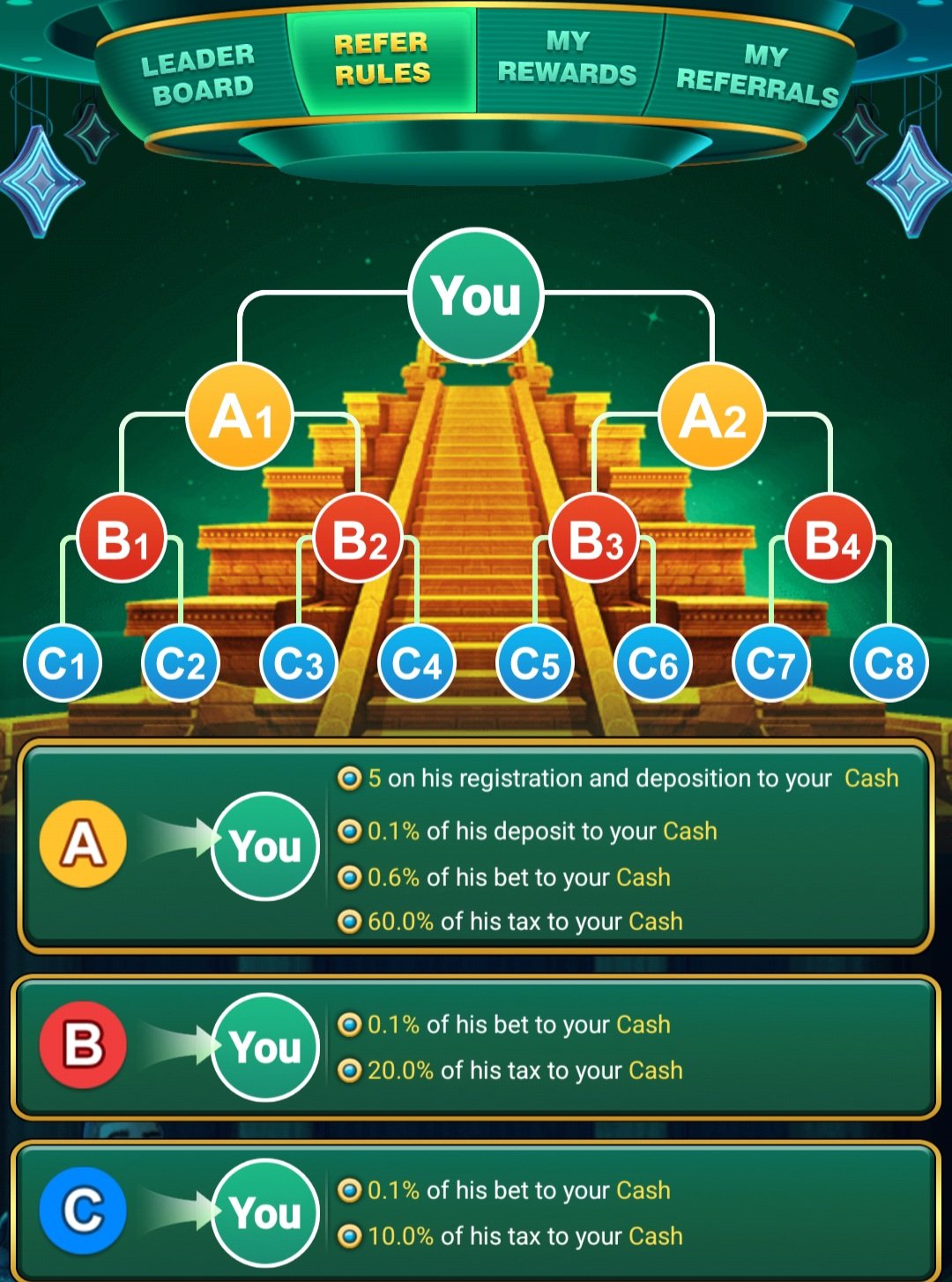 अगर आपने दो लोगो को share किया और उन्होंने उसे downlod करके game play कर रहे हैं तो आपको 0.1% का cash मिलता हैं और amount diposit करके game play करके खेलते हैं तो आपको 0.6% cash back मिलता हैं। यदि वें game करते हैं तो आपको 60.0%का tax मिलता हैं। उसी प्रकार वें दोनों किसी और को game share करते हैं तो उनसे भी आपको 0.1% पर bet