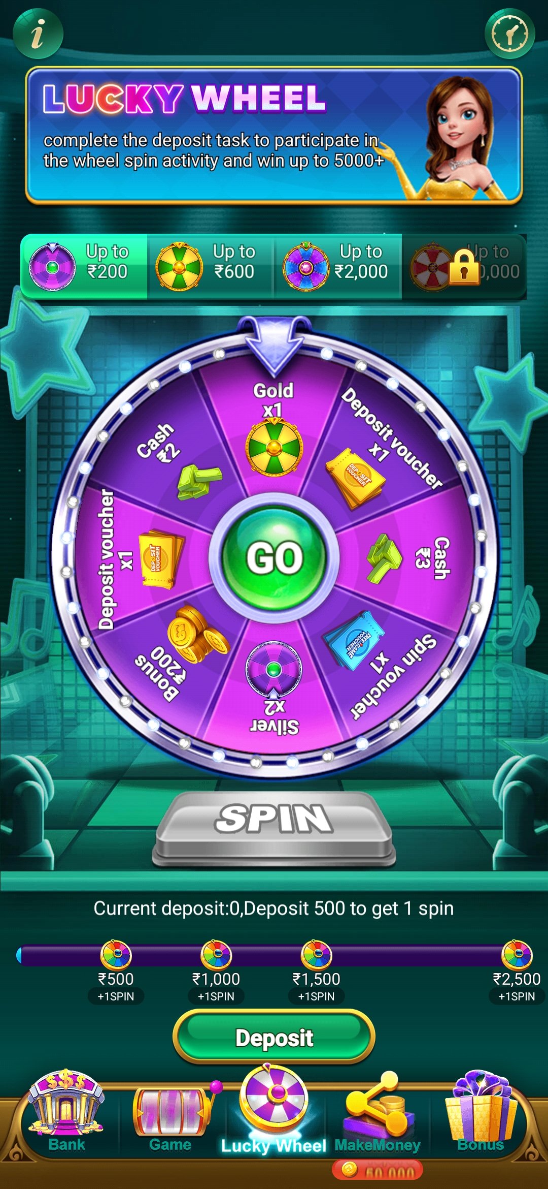 इस app में आपको spin wheel मिलते है जिसे आप leval बढ़ाके free में spin कर सकते है आपको यहाँ चार प्रकार के spin wheel मिलते हैं silvar, gold, dimond, स्पेशल जिसे 200₹, 600₹ 2000₹ का रिचार्ज करके spin कर सकते हैं।