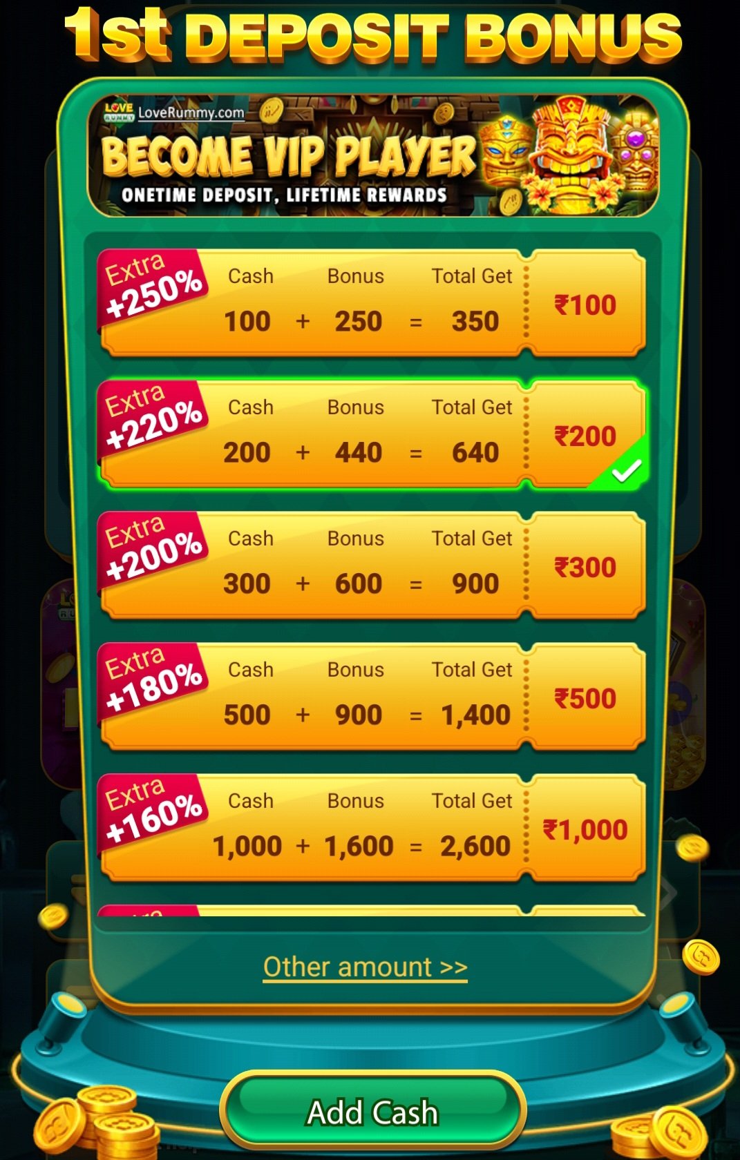 इस game में अगर आप first बार diposit करते हैं तो आपको 250% extra मिल जाता हैं। जैसे आप 100 रूपये add किये तो आपको 250रुपए extra बोनस मिलता हैं। वैसे ही 200 रुपए add करते हैं तो आपको 220% extra यानि कुल आपको 200+220= 440 रुपए मिलता हैं यानि आप जितना रुपए diposit करेंगे उतना परसेंट extra bonus मिल जाता है जिससे आप बहुत ज्यादा